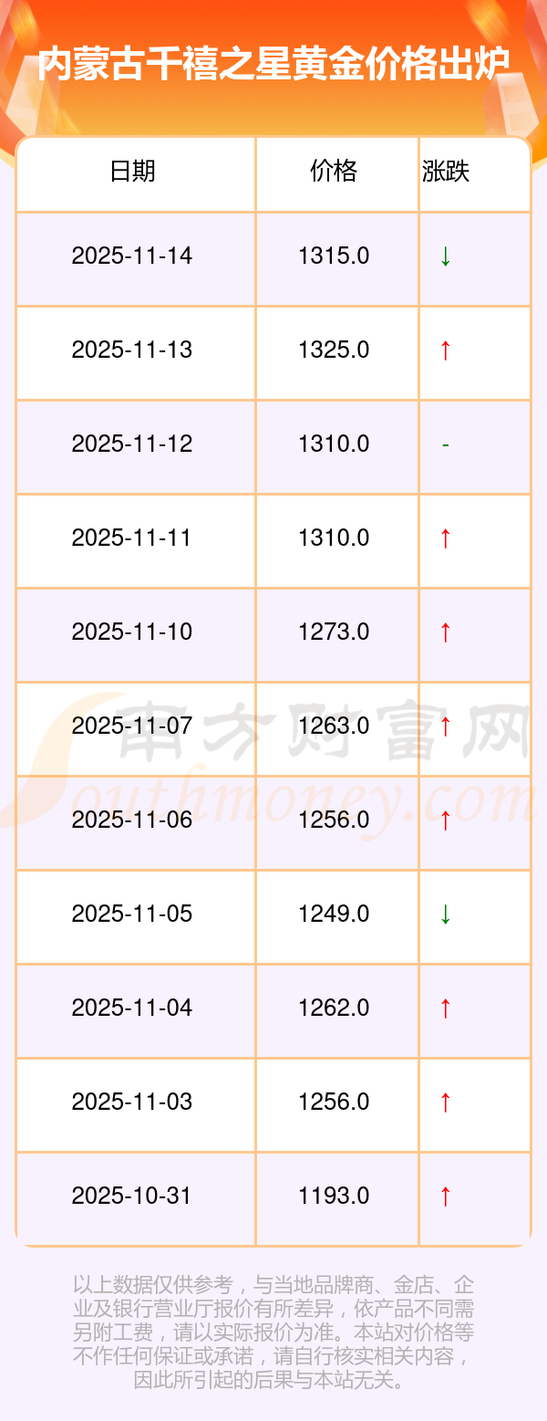 2025年11月15日,內(nèi)蒙古千禧之星所售黃金價格,其價格設(shè)定為 1315.0元/克。