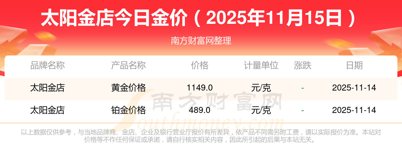 2025年11月15日太陽金店今日價格:黃金價格1333.0元/克,鉑金價格646.0元/克,飾品金價(內(nèi)地)1333.0元/克,黃金飾品(香港)46320.0,鉑金價格(香港)18410.0,金條價格(香港)41780.0,金條金價(內(nèi)地)1167.0元/克,黃金價格1322.0元/克,鉑金價格600.0元/克,足金價格1322.0元/克,黃金價格1295.0元/克。