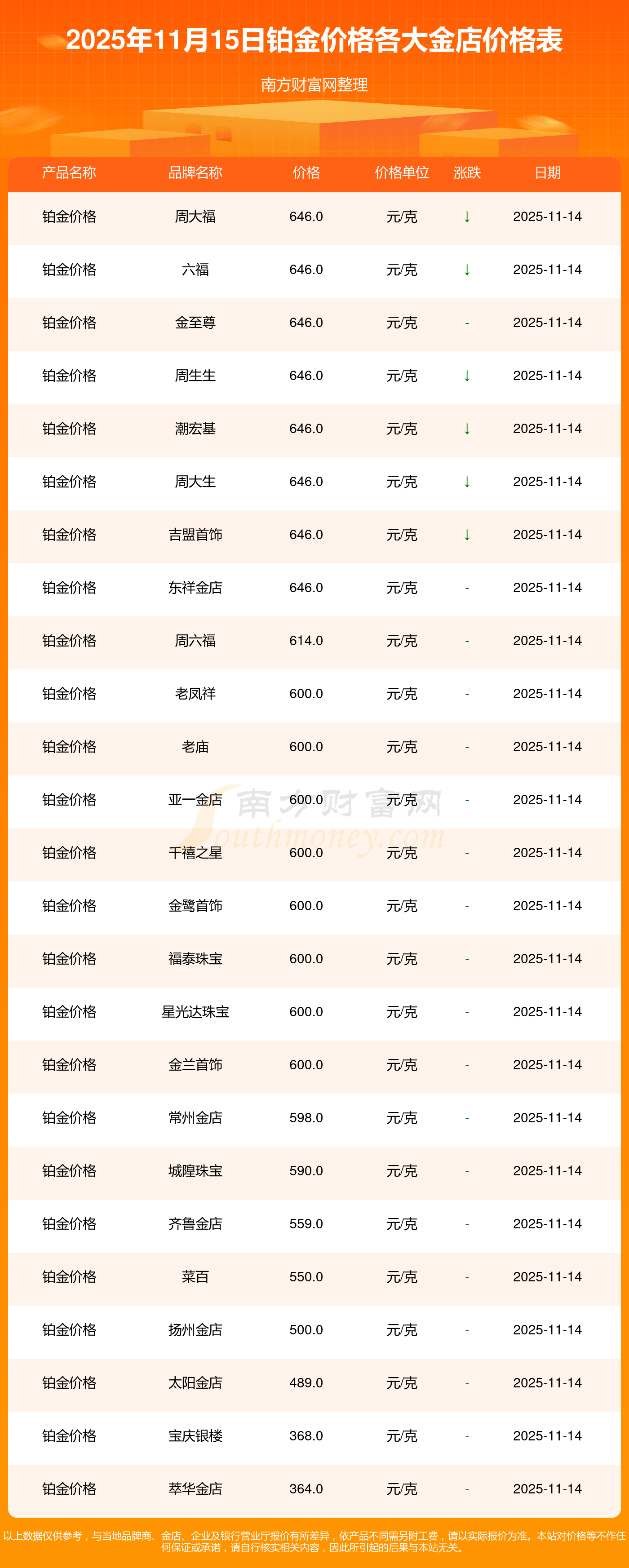 2025年11月15日各大金店鉑金價格最新價格:周大福1333.0元/克,周大福646.0元/克,周大福1333.0元/克,周大福46320.0,周大福18410.0,周大福41780.0,周大福1167.0元/克,老鳳祥1322.0元/克,老鳳祥600.0元/克,老鳳祥1322.0元/克,周六福1295.0元/克。