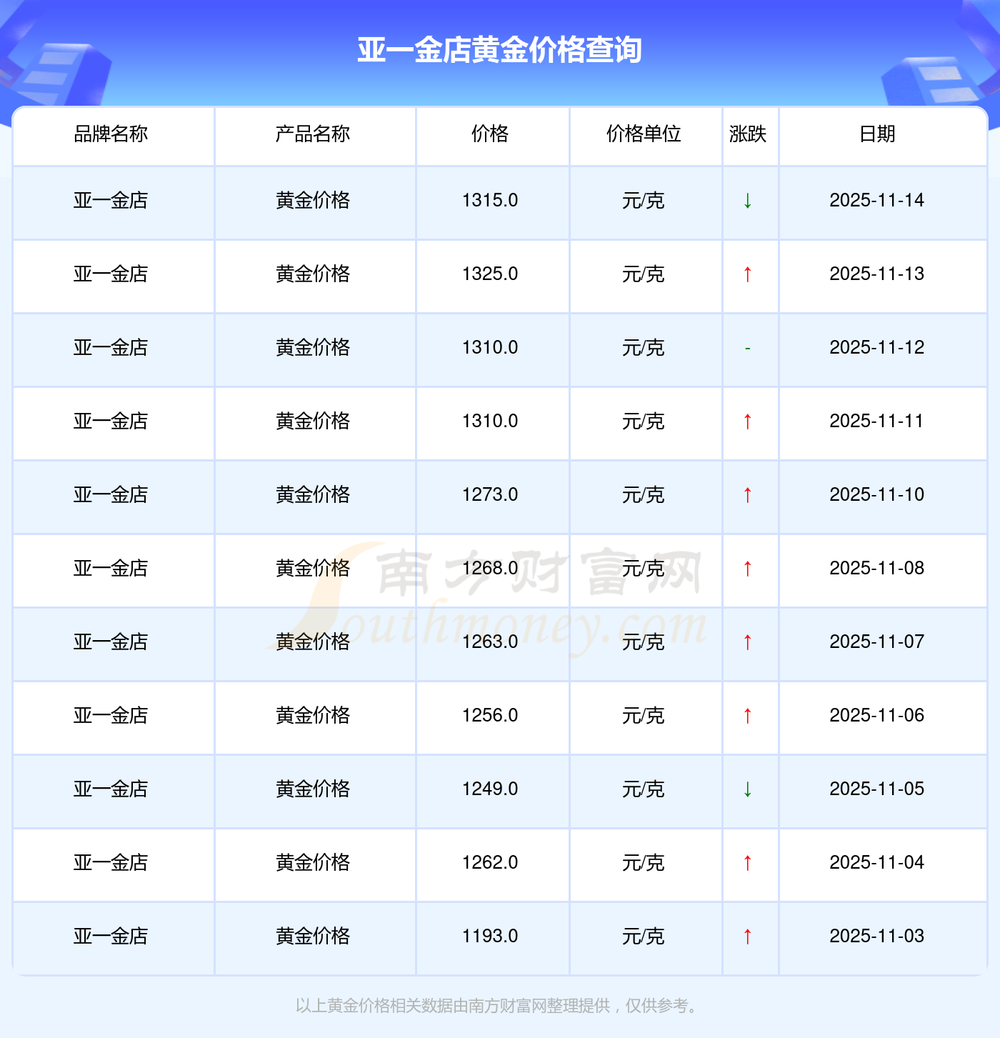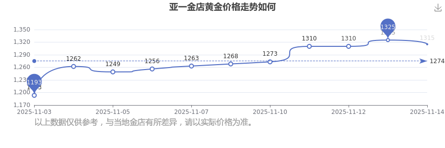 亞一金店今日黃金價格的最新標價為1315.0元/克。