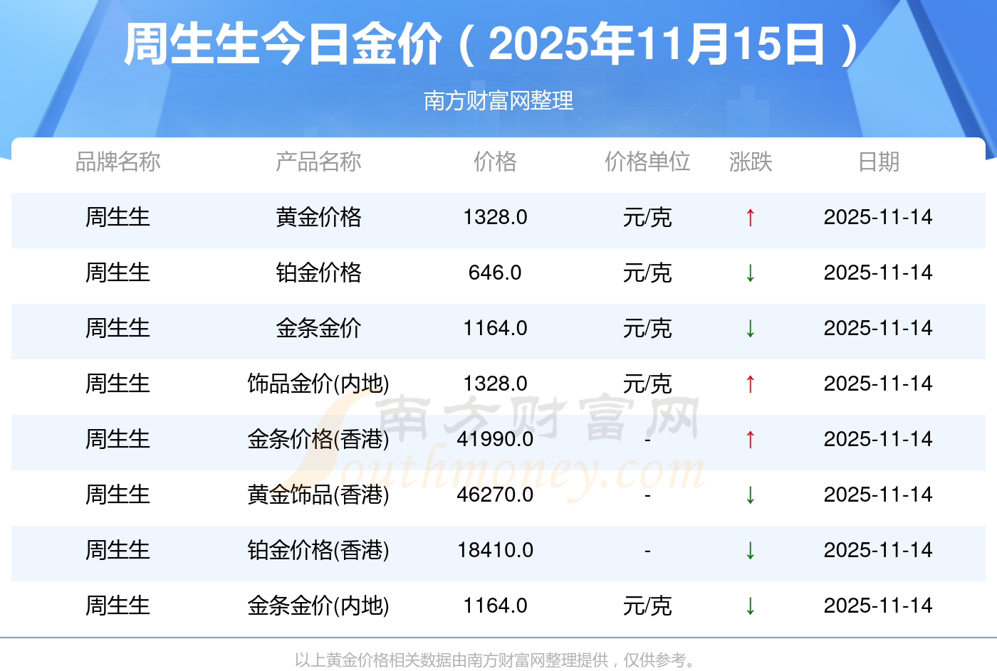 2025年11月15日周生生今日價(jià)格:黃金價(jià)格1333.0元/克,鉑金價(jià)格646.0元/克,飾品金價(jià)(內(nèi)地)1333.0元/克,黃金飾品(香港)46320.0,鉑金價(jià)格(香港)18410.0,金條價(jià)格(香港)41780.0,金條金價(jià)(內(nèi)地)1167.0元/克,黃金價(jià)格1322.0元/克,鉑金價(jià)格600.0元/克,足金價(jià)格1322.0元/克,黃金價(jià)格1295.0元/克。