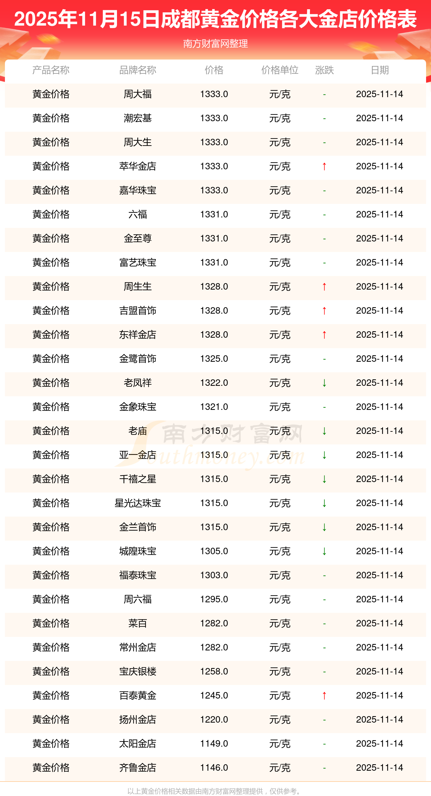 今天是2025年11月15日,成都周大福、周大福、周大福、周大福、周大福、周大福、周大福、老鳳祥、老鳳祥、老鳳祥、周六福等各大金店品牌黃金價格最新價格如下:周大福1333.0元/克、周大福646.0元/克、周大福1333.0元/克、周大福46320.0、周大福18410.0、周大福41780.0、周大福1167.0元/克、老鳳祥1322.0元/克、老鳳祥600.0元/克、老鳳祥1322.0元/克、周六福1295.0元/克。