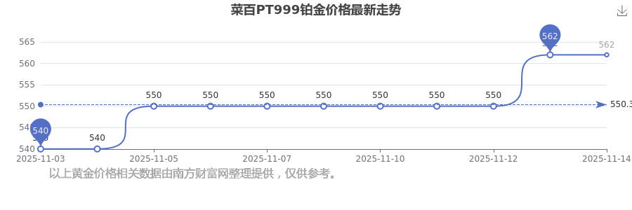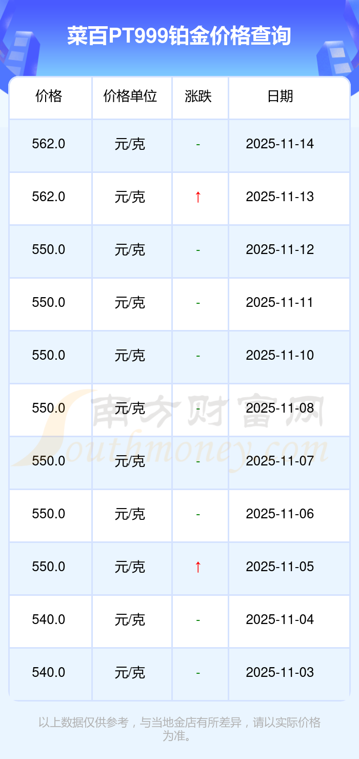 今日菜百PT999鉑金價格最新查詢:562.0元/克。