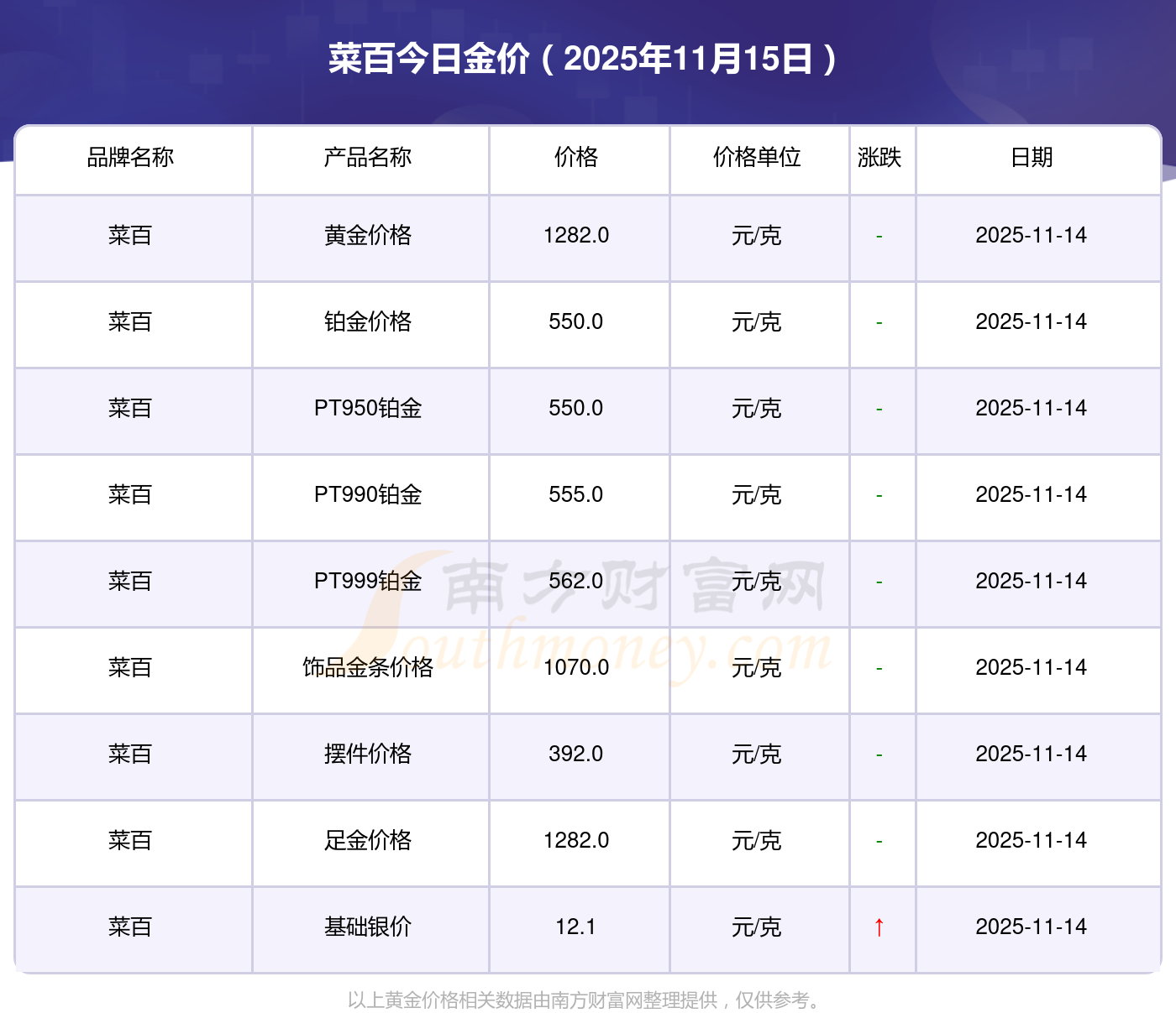 以上數(shù)據(jù)僅供參考,與當(dāng)?shù)仄放粕、金店、企業(yè)及銀行營(yíng)業(yè)廳報(bào)價(jià)有所差異,依產(chǎn)品不同需另附工費(fèi),請(qǐng)以實(shí)際報(bào)價(jià)為準(zhǔn)。本站對(duì)價(jià)格等不作任何保證或承諾,請(qǐng)自行核實(shí)相關(guān)內(nèi)容,因此所引起的后果與本站無(wú)關(guān)。