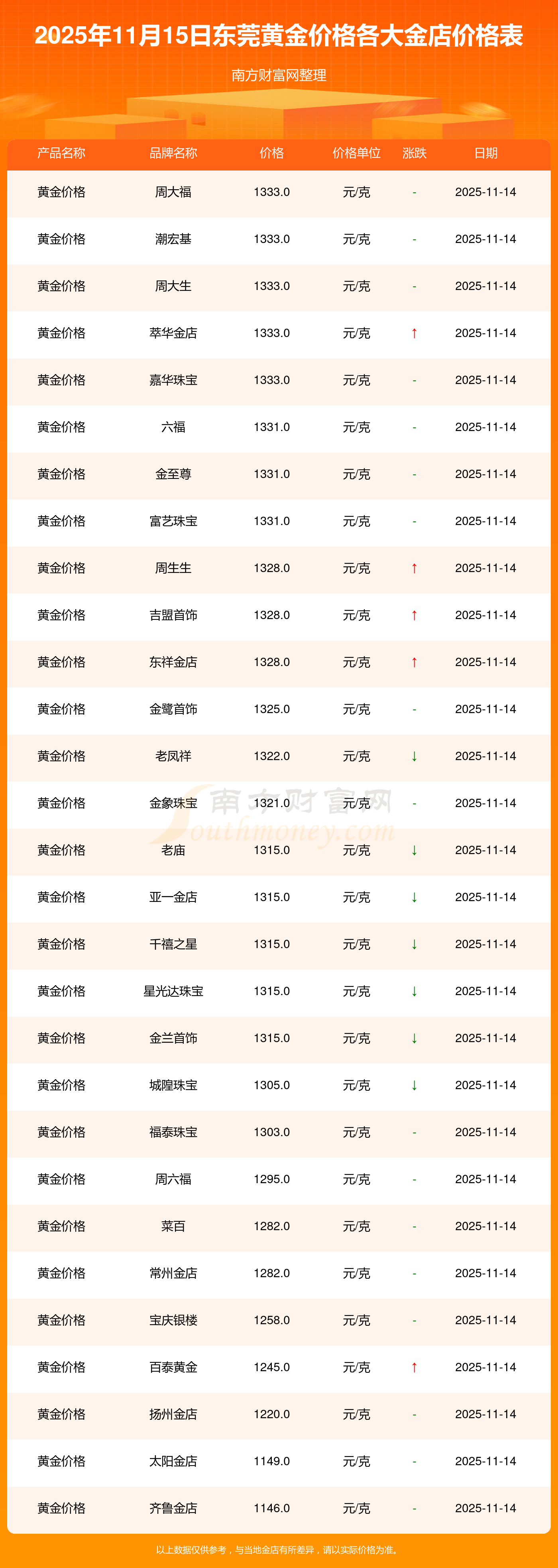 今天是2025年11月15日,東莞周大福、周大福、周大福、周大福、周大福、周大福、周大福、老鳳祥、老鳳祥、老鳳祥、周六福等各大金店品牌黃金價(jià)格最新價(jià)格如下:周大福1333.0元/克、周大福646.0元/克、周大福1333.0元/克、周大福46320.0、周大福18410.0、周大福41780.0、周大福1167.0元/克、老鳳祥1322.0元/克、老鳳祥600.0元/克、老鳳祥1322.0元/克、周六福1295.0元/克。