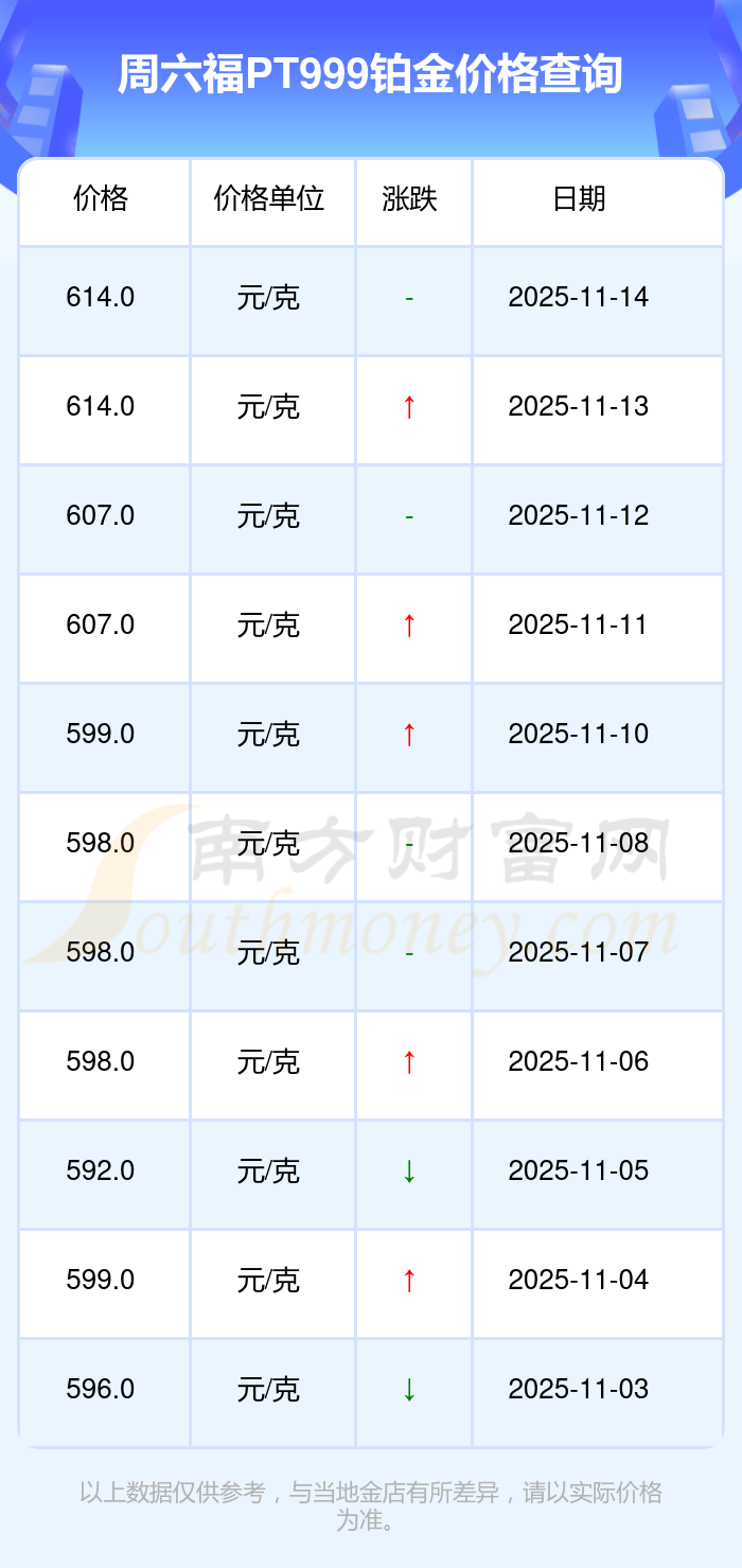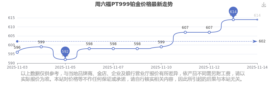 2025年11月15日周六福PT999鉑金價格是614.0元/克。