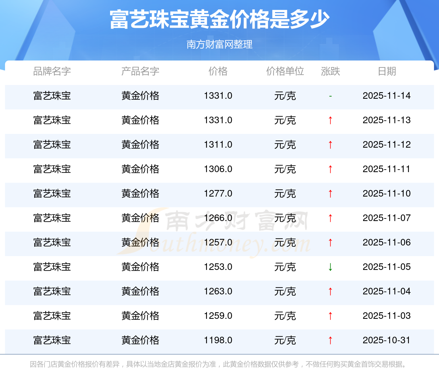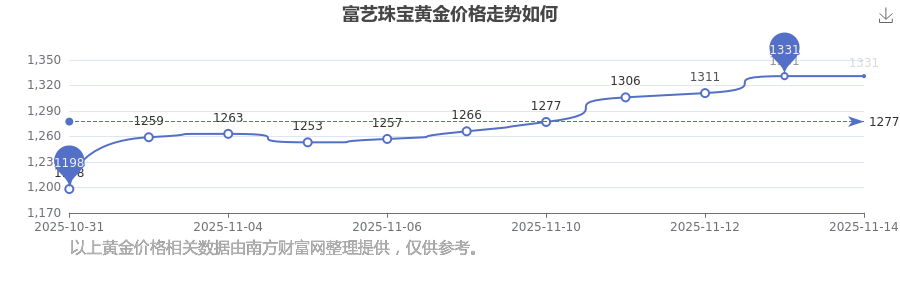 1331.0元/克成為富藝珠寶今日 黃金價(jià)格的最新交易的價(jià)格。