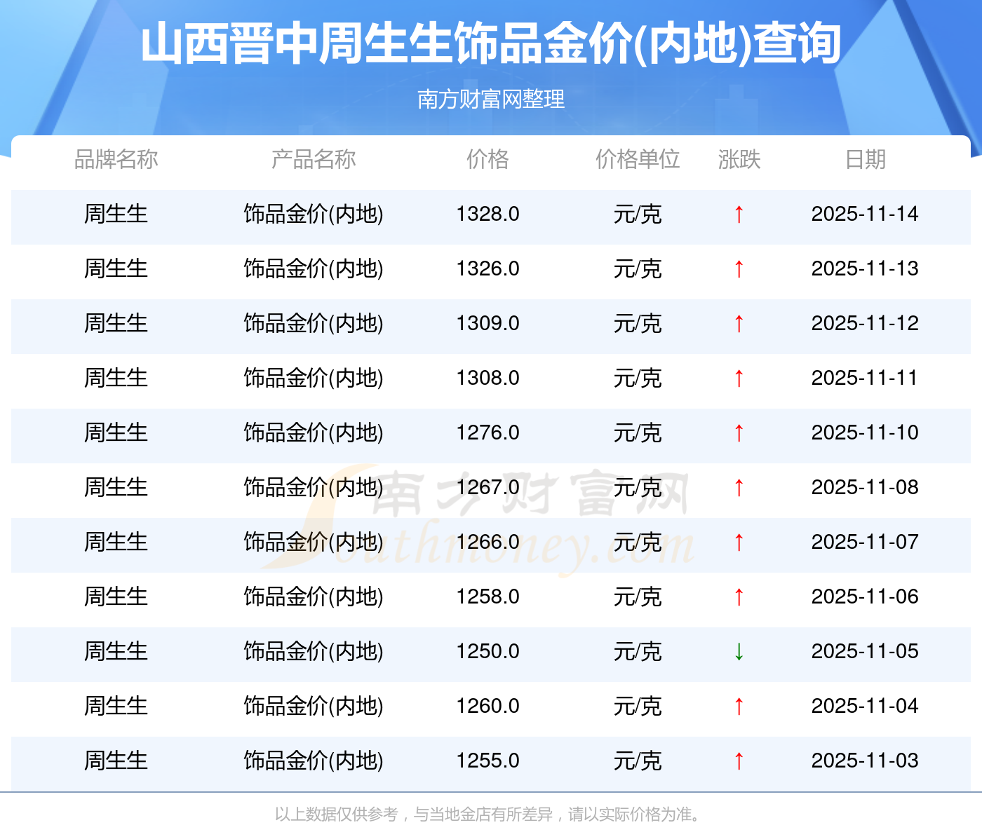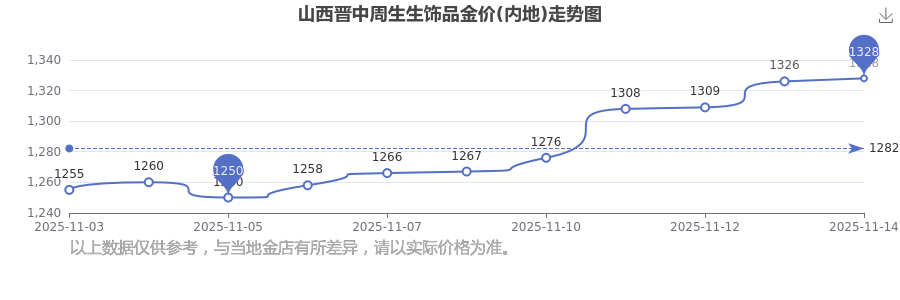 (2025年11月15日)山西晉中周生生飾品金價(內(nèi)地)現(xiàn)在為1328.0元/克。