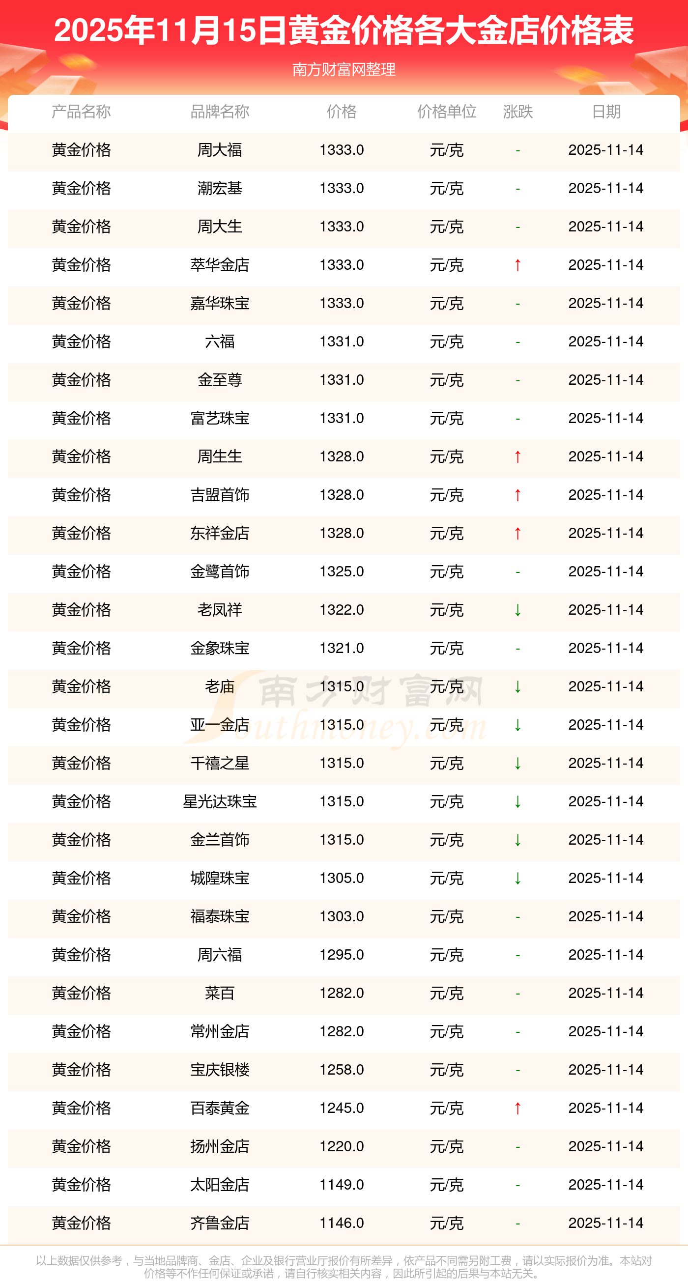 2025年11月15日,周大福、周大福、周大福、周大福、周大福、周大福、周大福、老鳳祥、老鳳祥、老鳳祥、周六福等各大金店品牌黃金價(jià)格今日價(jià)格如下:周大福1333.0元/克、周大福646.0元/克、周大福1333.0元/克、周大福46320.0、周大福18410.0、周大福41780.0、周大福1167.0元/克、老鳳祥1322.0元/克、老鳳祥600.0元/克、老鳳祥1322.0元/克、周六福1295.0元/克。