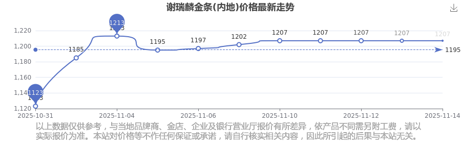 今日(2025年11月15日)謝瑞麟金條(內(nèi)地)價(jià)格:1207.0元/克。