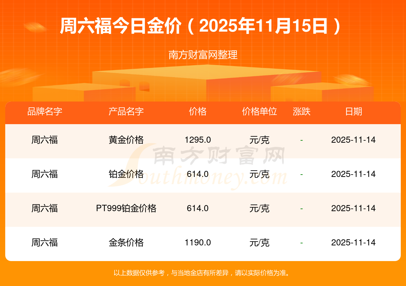 2025年11月15日周六福金價查詢:黃金價格1333.0元/克,鉑金價格646.0元/克,飾品金價(內(nèi)地)1333.0元/克,黃金飾品(香港)46320.0,鉑金價格(香港)18410.0,金條價格(香港)41780.0,金條金價(內(nèi)地)1167.0元/克,黃金價格1322.0元/克,鉑金價格600.0元/克,足金價格1322.0元/克,黃金價格1295.0元/克。