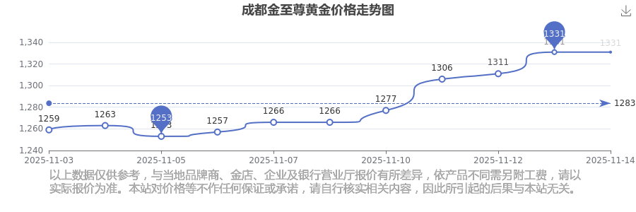 成都金至尊黃金價格在 2025年11月15日為 1331.0元/克。