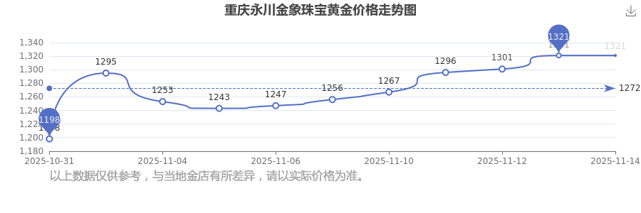 2025年11月15日這一天,重慶永川金象珠寶的黃金價(jià)格以 1321.0元/克的價(jià)格售賣。