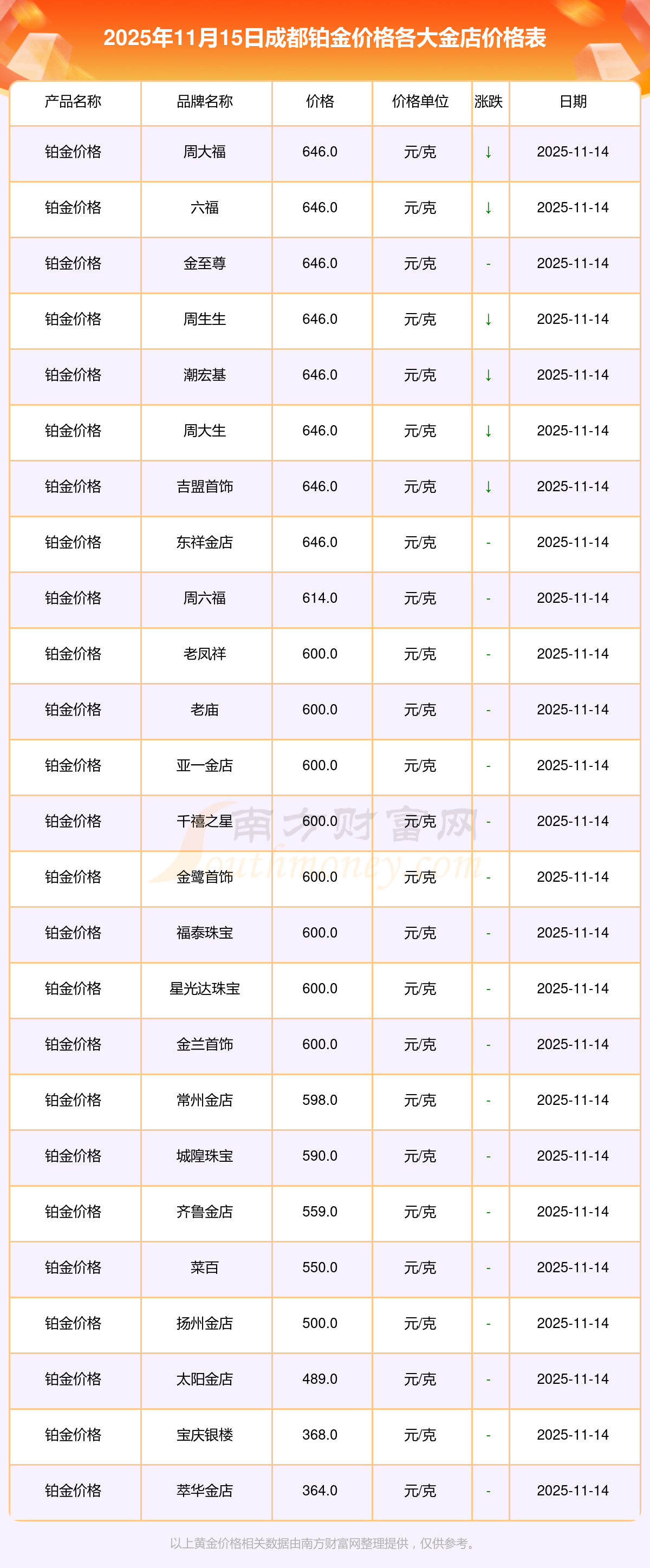 2025年11月15日,成都周大福、周大福、周大福、周大福、周大福、周大福、周大福、老鳳祥、老鳳祥、老鳳祥、周六福等各大金店品牌鉑金價格今日價格行情最新來了:周大福1333.0元/克、周大福646.0元/克、周大福1333.0元/克、周大福46320.0、周大福18410.0、周大福41780.0、周大福1167.0元/克、老鳳祥1322.0元/克、老鳳祥600.0元/克、老鳳祥1322.0元/克、周六福1295.0元/克。