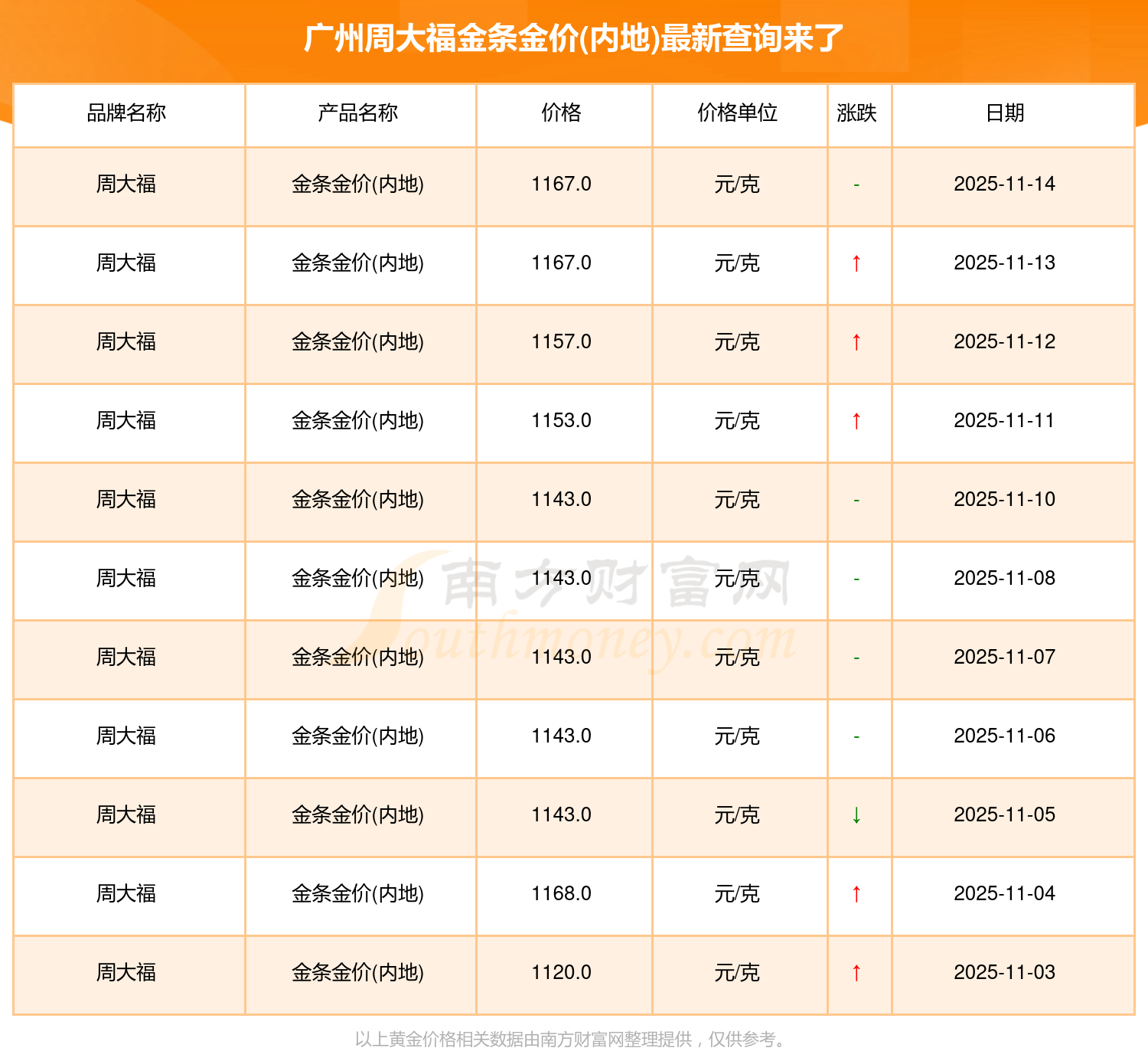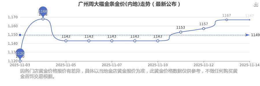 今日廣州周大福金條金價(jià)(內(nèi)地):1167.0元/克。