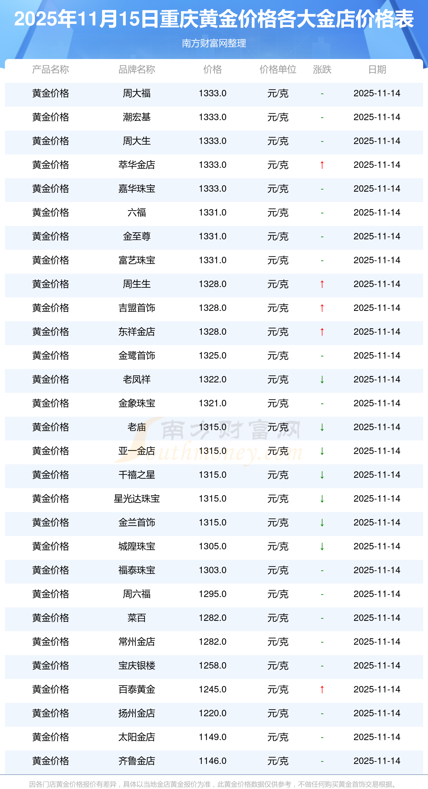 2025年11月15日,重慶周大福、周大福、周大福、周大福、周大福、周大福、周大福、老鳳祥、老鳳祥、老鳳祥、周六福等各大金店品牌黃金價格今日價格如下:周大福1333.0元/克、周大福646.0元/克、周大福1333.0元/克、周大福46320.0、周大福18410.0、周大福41780.0、周大福1167.0元/克、老鳳祥1322.0元/克、老鳳祥600.0元/克、老鳳祥1322.0元/克、周六福1295.0元/克。