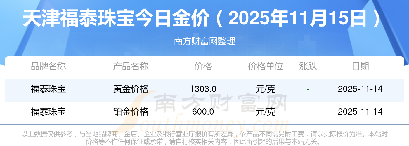 想查詢今日黃金價(jià)格,當(dāng)下黃金一克具體售價(jià)幾何? 2025年11月15日天津福泰珠寶每克黃金的市場(chǎng)價(jià)格是多少:黃金價(jià)格1333.0元/克,鉑金價(jià)格646.0元/克,飾品金價(jià)(內(nèi)地)1333.0元/克,黃金飾品(香港)46320.0,鉑金價(jià)格(香港)18410.0,金條價(jià)格(香港)41780.0,金條金價(jià)(內(nèi)地)1167.0元/克,黃金價(jià)格1322.0元/克,鉑金價(jià)格600.0元/克,足金價(jià)格1322.0元/克,黃金價(jià)格1295.0元/克。
