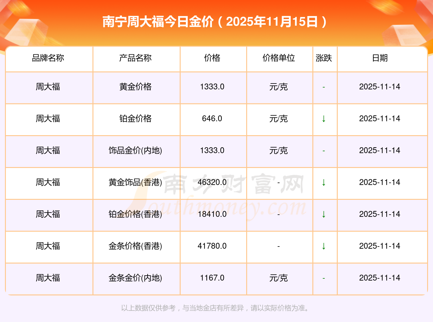 2025年11月15日南寧周大福一克黃金對應(yīng)的價格是多少?黃金價格1333.0元/克,鉑金價格646.0元/克,飾品金價(內(nèi)地)1333.0元/克,黃金飾品(香港)46320.0,鉑金價格(香港)18410.0,金條價格(香港)41780.0,金條金價(內(nèi)地)1167.0元/克,黃金價格1322.0元/克,鉑金價格600.0元/克,足金價格1322.0元/克,黃金價格1295.0元/克。