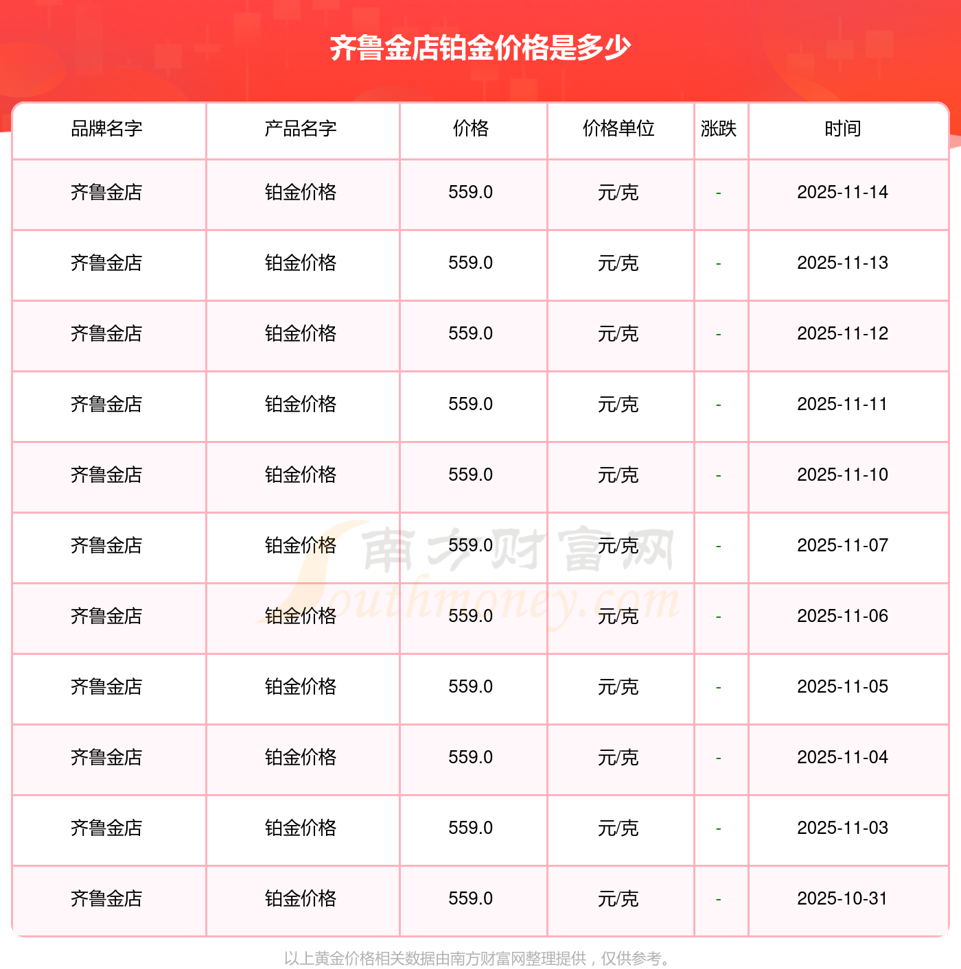 今日齊魯金店鉑金價(jià)格最新為559.0元/克。