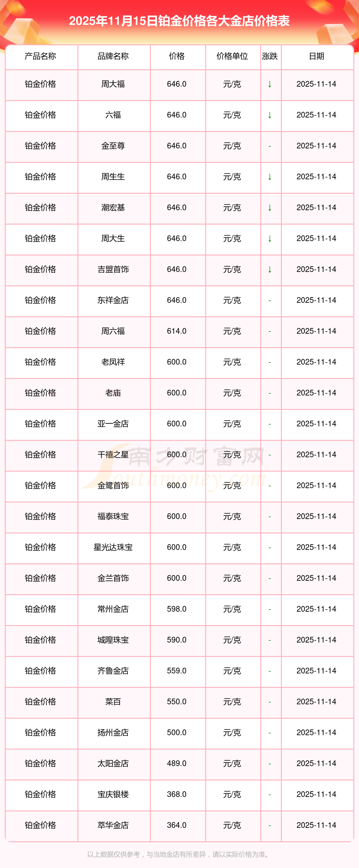 2025年11月15日周大福、周大福、周大福、周大福、周大福、周大福、周大福、老鳳祥、老鳳祥、老鳳祥、周六福等各大金店品牌鉑金價(jià)格最新價(jià)格如下:周大福黃金價(jià)格1333.0元/克,周大福鉑金價(jià)格646.0元/克,周大福飾品金價(jià)(內(nèi)地)1333.0元/克,周大福黃金飾品(香港)46320.0,周大福鉑金價(jià)格(香港)18410.0,周大福金條價(jià)格(香港)41780.0,周大福金條金價(jià)(內(nèi)地)1167.0元/克,老鳳祥黃金價(jià)格1322.0元/克,老鳳祥鉑金價(jià)格600.0元/克,老鳳祥足金價(jià)格1322.0元/克,周六福黃金價(jià)格1295.0元/克。