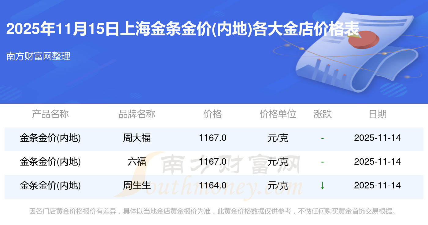 今天是2025年11月15日,上海周大福、周大福、周大福、周大福、周大福、周大福、周大福、老鳳祥、老鳳祥、老鳳祥、周六福等各大金店品牌金條金價(內(nèi)地)最新價格如下:周大福1333.0元/克、周大福646.0元/克、周大福1333.0元/克、周大福46320.0、周大福18410.0、周大福41780.0、周大福1167.0元/克、老鳳祥1322.0元/克、老鳳祥600.0元/克、老鳳祥1322.0元/克、周六福1295.0元/克。