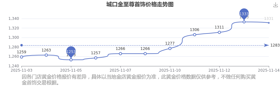 今日(2025年11月15日),城口金至尊首飾的價(jià)格是1331.0元/克。