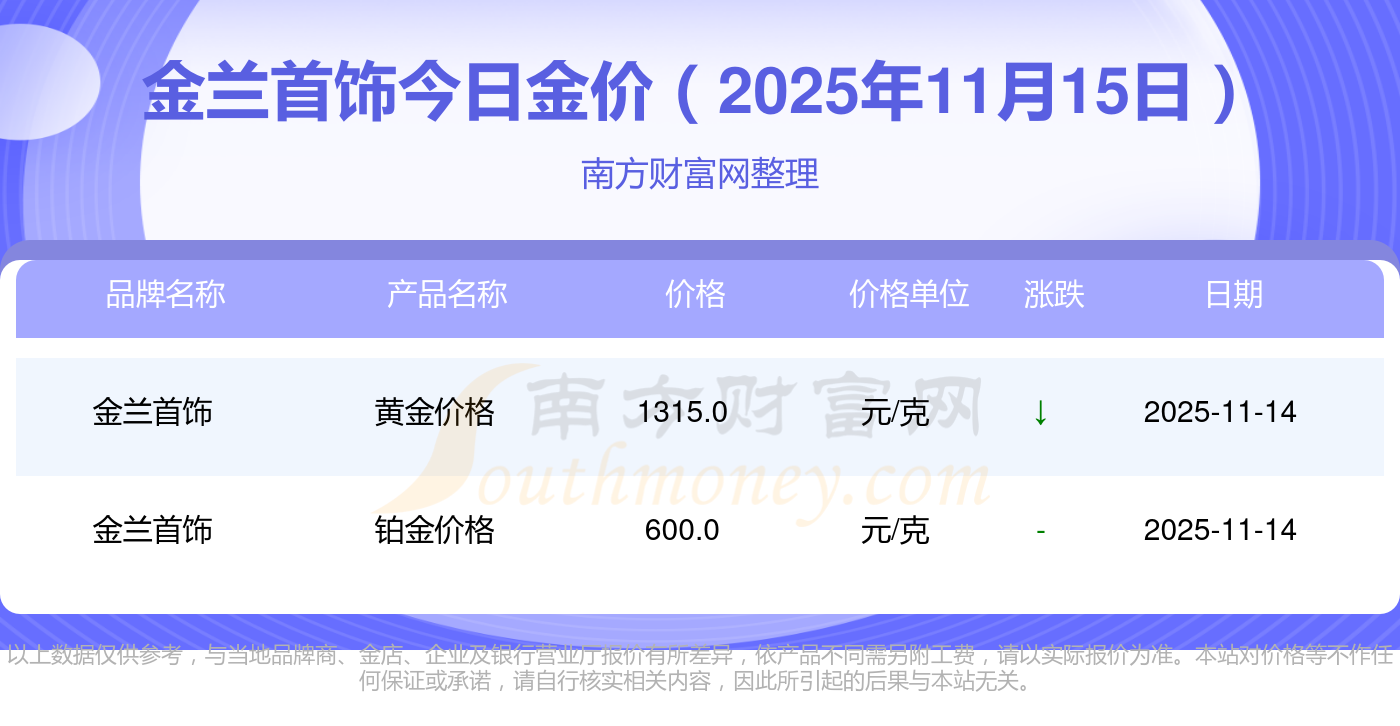 2025年11月15日金蘭首飾金價查詢:黃金價格1333.0元/克,鉑金價格646.0元/克,飾品金價(內(nèi)地)1333.0元/克,黃金飾品(香港)46320.0,鉑金價格(香港)18410.0,金條價格(香港)41780.0,金條金價(內(nèi)地)1167.0元/克,黃金價格1322.0元/克,鉑金價格600.0元/克,足金價格1322.0元/克,黃金價格1295.0元/克。