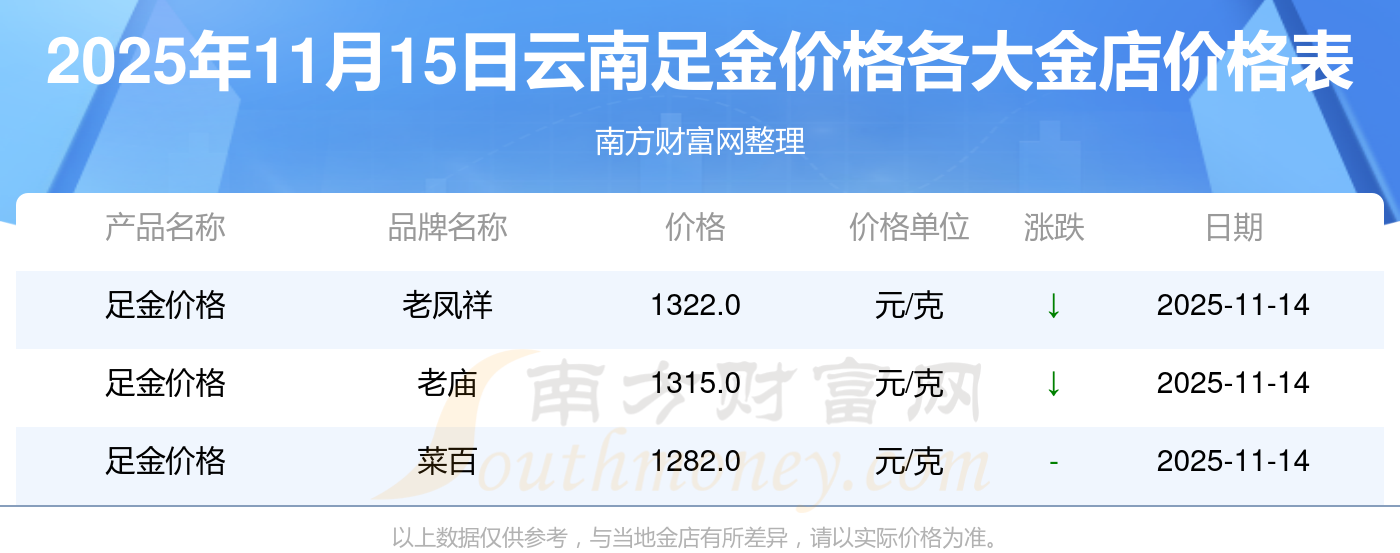 2025年11月15日云南各大金店足金價(jià)格最新價(jià)格查詢來了:周大福1333.0元/克,周大福646.0元/克,周大福1333.0元/克,周大福46320.0,周大福18410.0,周大福41780.0,周大福1167.0元/克,老鳳祥1322.0元/克,老鳳祥600.0元/克,老鳳祥1322.0元/克,周六福1295.0元/克。