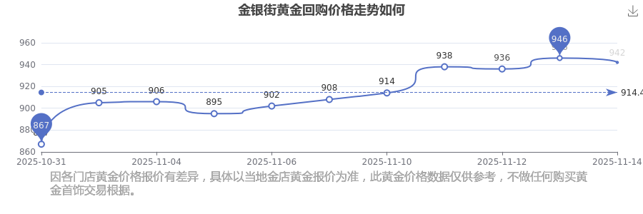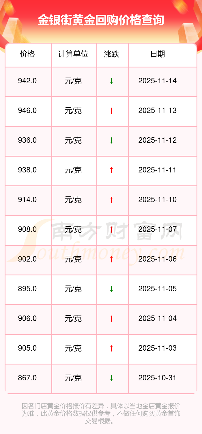 據(jù)了解,金銀街今日黃金回購價(jià)格為942.0元/克。