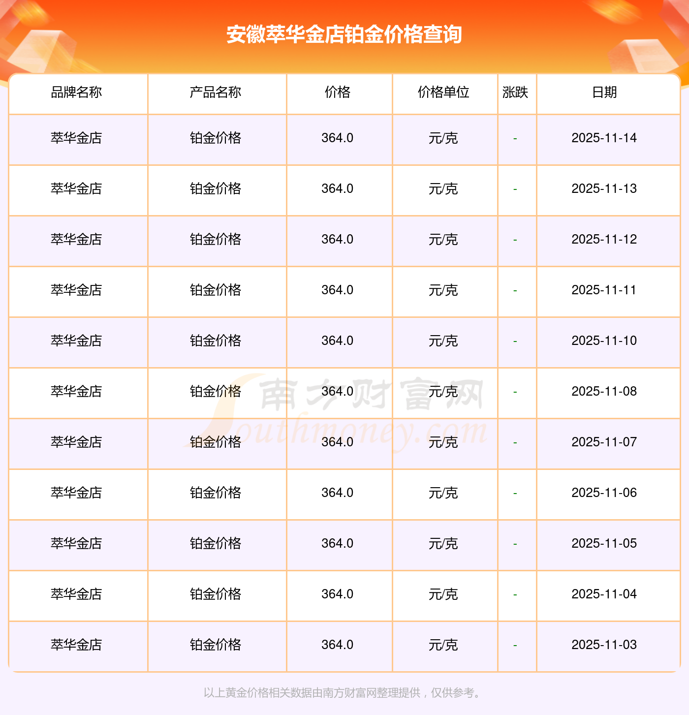今日安徽萃華金店鉑金價格是364.0元/克。