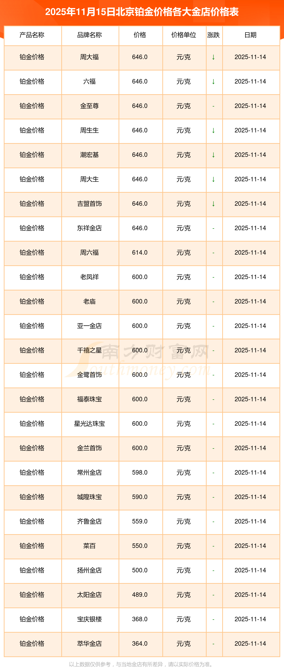 今天是2025年11月15日,北京周大福、周大福、周大福、周大福、周大福、周大福、周大福、老鳳祥、老鳳祥、老鳳祥、周六福等各大金店品牌鉑金價格最新價格行情是這樣的:周大福1333.0元/克、周大福646.0元/克、周大福1333.0元/克、周大福46320.0、周大福18410.0、周大福41780.0、周大福1167.0元/克、老鳳祥1322.0元/克、老鳳祥600.0元/克、老鳳祥1322.0元/克、周六福1295.0元/克。