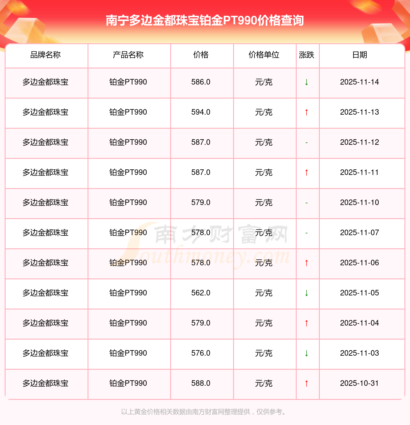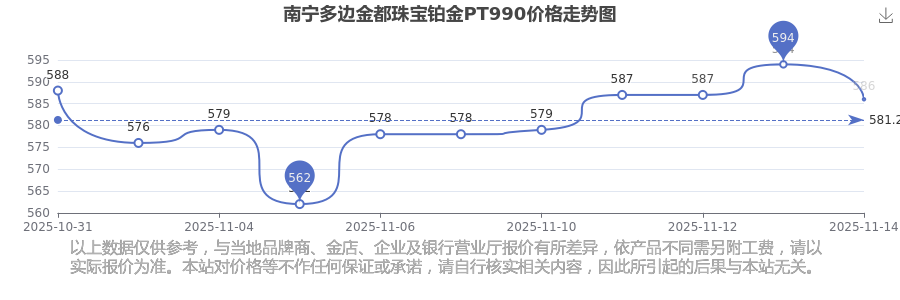 今日南寧多邊金都珠寶鉑金PT990價(jià)格為586.0元/克。