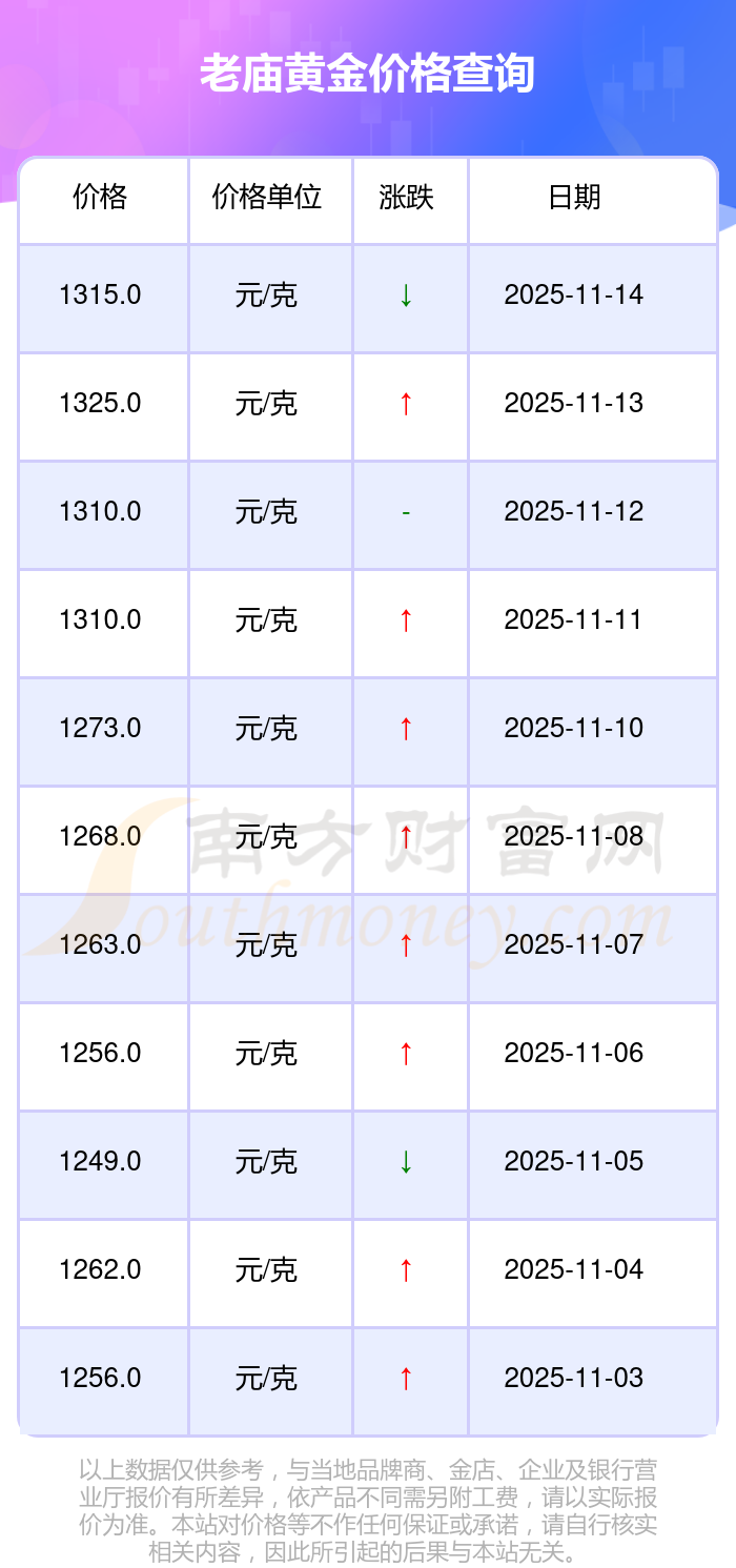 今日老廟黃金價格:1315.0元/克。