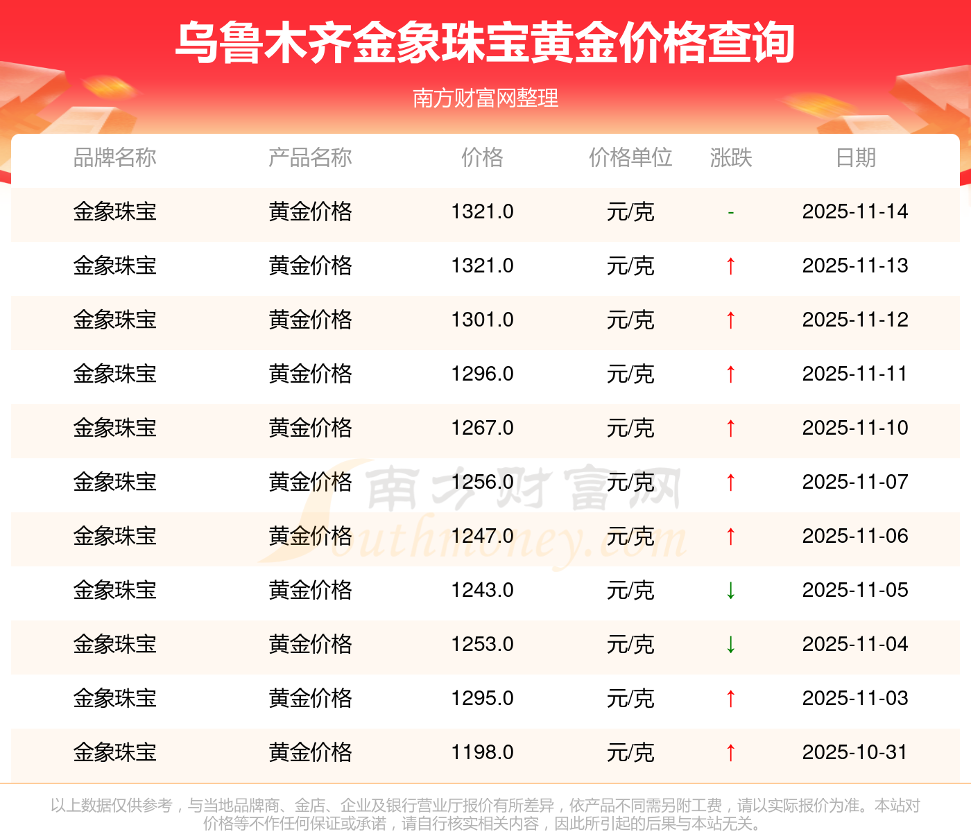 烏魯木齊金象珠寶今日黃金價格(今天黃金一克的售賣價格是多少)?今日烏魯木齊金象珠寶黃金價格查詢,2025年11月16日,烏魯木齊金象珠寶黃金價格每克的價值量定格在1321.0元/克。