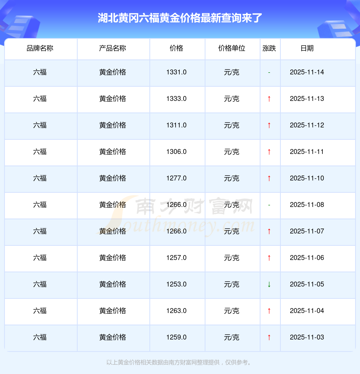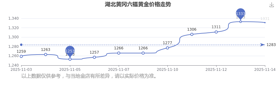 2025年11月16日湖北黃岡六福黃金價(jià)格:1331.0元/克。