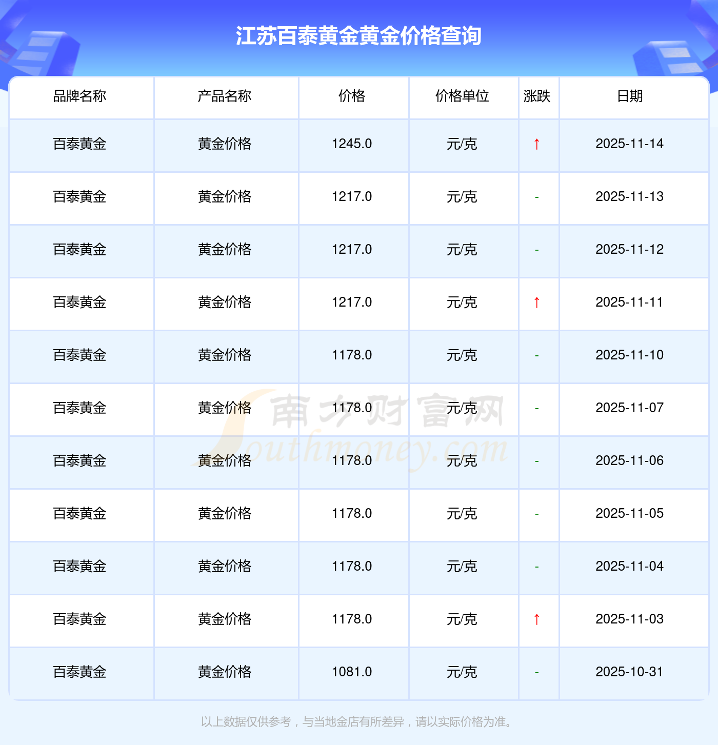 今日江蘇百泰黃金黃金價(jià)格公布想問(wèn)問(wèn),今日黃金每克的定價(jià)為多少2025年11月16日這一天,江蘇百泰黃金的黃金價(jià)格以 1245.0元/克的價(jià)格售賣(mài)。