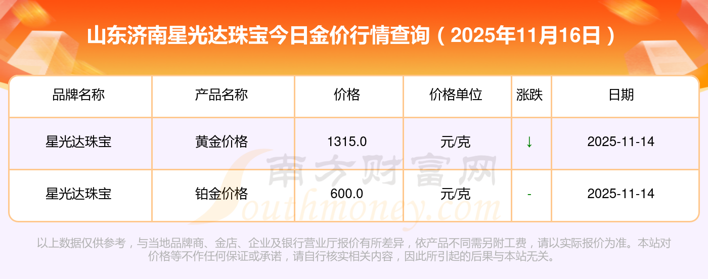 2025年11月16日山東濟(jì)南星光達(dá)珠寶今日價(jià)格:黃金價(jià)格1333.0元/克,鉑金價(jià)格646.0元/克,飾品金價(jià)(內(nèi)地)1333.0元/克,黃金飾品(香港)46320.0,鉑金價(jià)格(香港)18410.0,金條價(jià)格(香港)41780.0,金條金價(jià)(內(nèi)地)1167.0元/克,黃金價(jià)格1322.0元/克,鉑金價(jià)格600.0元/克,足金價(jià)格1322.0元/克,黃金價(jià)格1295.0元/克。