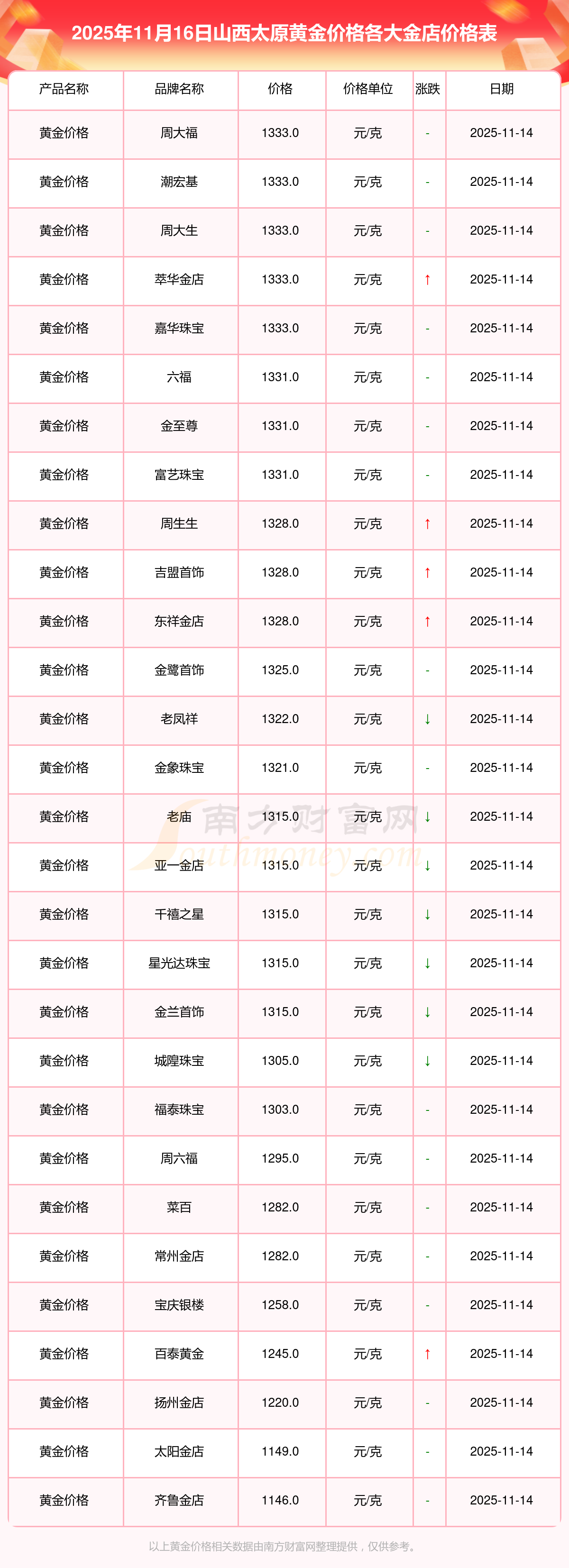 2025年11月16日山西太原周大福、周大福、周大福、周大福、周大福、周大福、周大福、老鳳祥、老鳳祥、老鳳祥、周六福等各大金店品牌黃金價格最新價格行情來了,如下:周大福黃金價格1333.0元/克,周大福鉑金價格646.0元/克,周大福飾品金價(內(nèi)地)1333.0元/克,周大福黃金飾品(香港)46320.0,周大福鉑金價格(香港)18410.0,周大福金條價格(香港)41780.0,周大福金條金價(內(nèi)地)1167.0元/克,老鳳祥黃金價格1322.0元/克,老鳳祥鉑金價格600.0元/克,老鳳祥足金價格1322.0元/克,周六福黃金價格1295.0元/克。