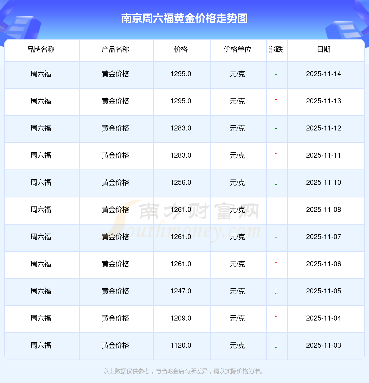 2025年11月16日南京周六福黃金價(jià)格:1295.0元/克。