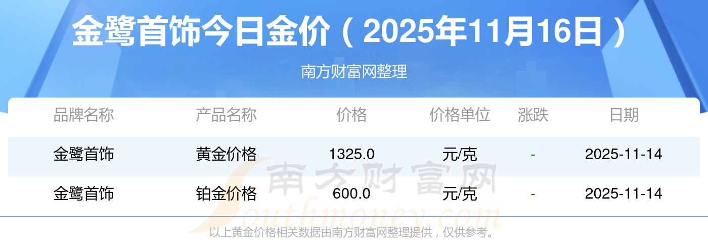 2025年11月16日周大福、周大福、周大福、周大福、周大福、周大福、周大福、老鳳祥、老鳳祥、老鳳祥、周六福等各大金店品牌黃金價格最新價格如下:周大福黃金價格1333.0元/克,周大福鉑金價格646.0元/克,周大福飾品金價(內(nèi)地)1333.0元/克,周大福黃金飾品(香港)46320.0,周大福鉑金價格(香港)18410.0,周大福金條價格(香港)41780.0,周大福金條金價(內(nèi)地)1167.0元/克,老鳳祥黃金價格1322.0元/克,老鳳祥鉑金價格600.0元/克,老鳳祥足金價格1322.0元/克,周六福黃金價格1295.0元/克。