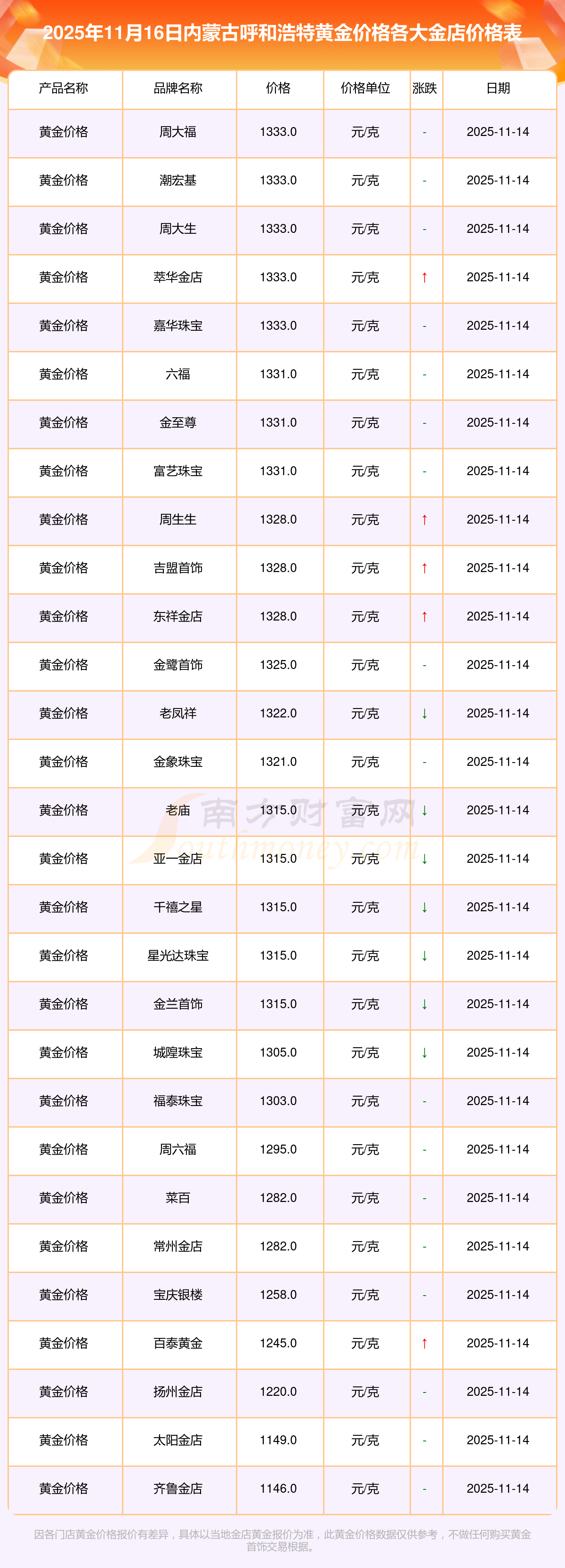 2025年11月16日內(nèi)蒙古呼和浩特周大福、周大福、周大福、周大福、周大福、周大福、周大福、老鳳祥、老鳳祥、老鳳祥、周六福等各大金店品牌黃金價(jià)格最新價(jià)格行情來(lái)了,如下:周大福黃金價(jià)格1333.0元/克,周大福鉑金價(jià)格646.0元/克,周大福飾品金價(jià)(內(nèi)地)1333.0元/克,周大福黃金飾品(香港)46320.0,周大福鉑金價(jià)格(香港)18410.0,周大福金條價(jià)格(香港)41780.0,周大福金條金價(jià)(內(nèi)地)1167.0元/克,老鳳祥黃金價(jià)格1322.0元/克,老鳳祥鉑金價(jià)格600.0元/克,老鳳祥足金價(jià)格1322.0元/克,周六福黃金價(jià)格1295.0元/克。