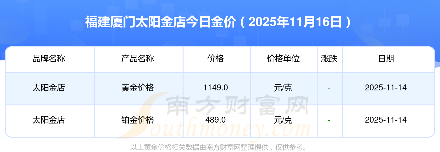 2025年11月16日福建廈門太陽金店今日價格:黃金價格1333.0元/克,鉑金價格646.0元/克,飾品金價(內(nèi)地)1333.0元/克,黃金飾品(香港)46320.0,鉑金價格(香港)18410.0,金條價格(香港)41780.0,金條金價(內(nèi)地)1167.0元/克,黃金價格1322.0元/克,鉑金價格600.0元/克,足金價格1322.0元/克,黃金價格1295.0元/克。