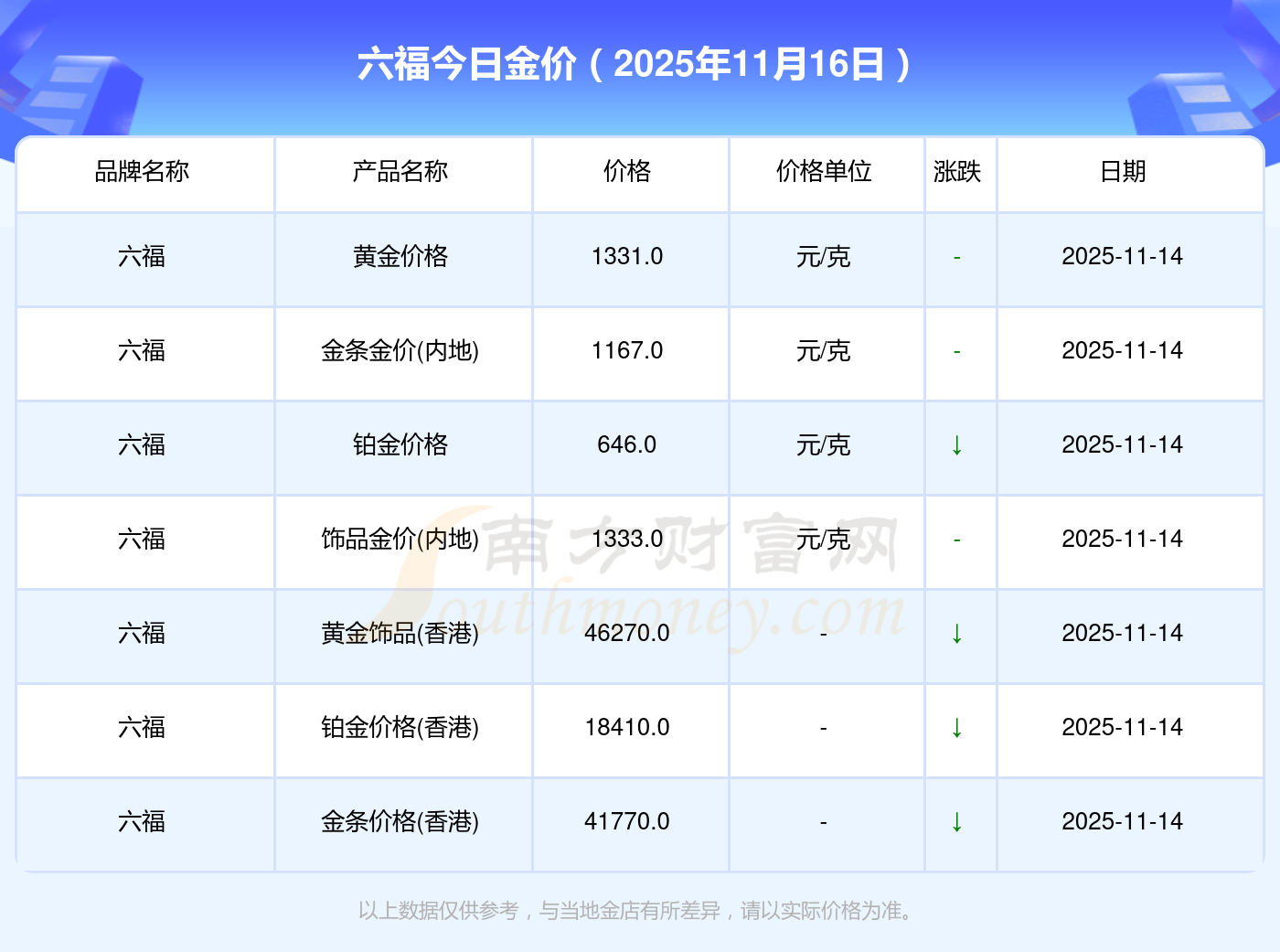 黃金價(jià)格1333.0元/克,鉑金價(jià)格646.0元/克,飾品金價(jià)(內(nèi)地)1333.0元/克,黃金飾品(香港)46320.0,鉑金價(jià)格(香港)18410.0,金條價(jià)格(香港)41780.0,金條金價(jià)(內(nèi)地)1167.0元/克,黃金價(jià)格1322.0元/克,鉑金價(jià)格600.0元/克,足金價(jià)格1322.0元/克,黃金價(jià)格1295.0元/克。