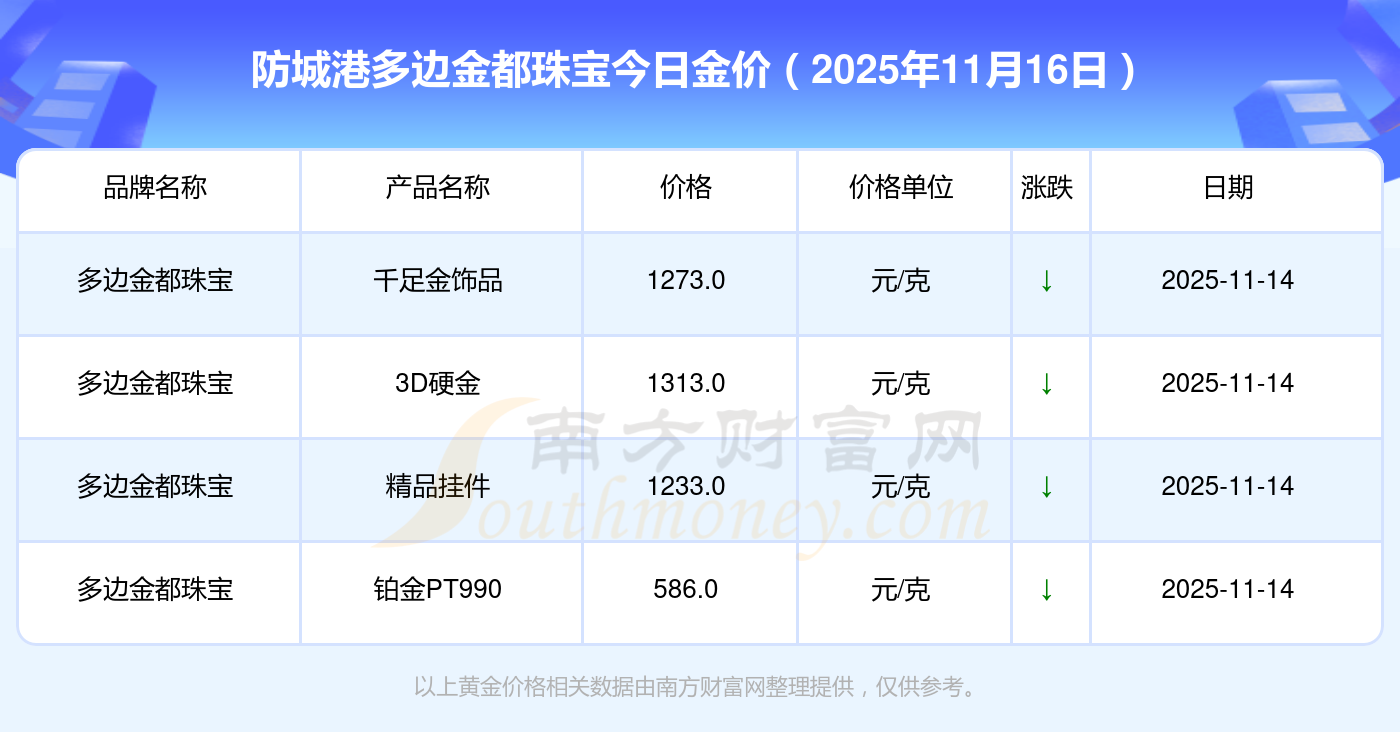 2025年11月16日防城港多邊金都珠寶一克黃金的售價是多少:黃金價格1333.0元/克,鉑金價格646.0元/克,飾品金價(內地)1333.0元/克,黃金飾品(香港)46320.0,鉑金價格(香港)18410.0,金條價格(香港)41780.0,金條金價(內地)1167.0元/克,黃金價格1322.0元/克,鉑金價格600.0元/克,足金價格1322.0元/克,黃金價格1295.0元/克。