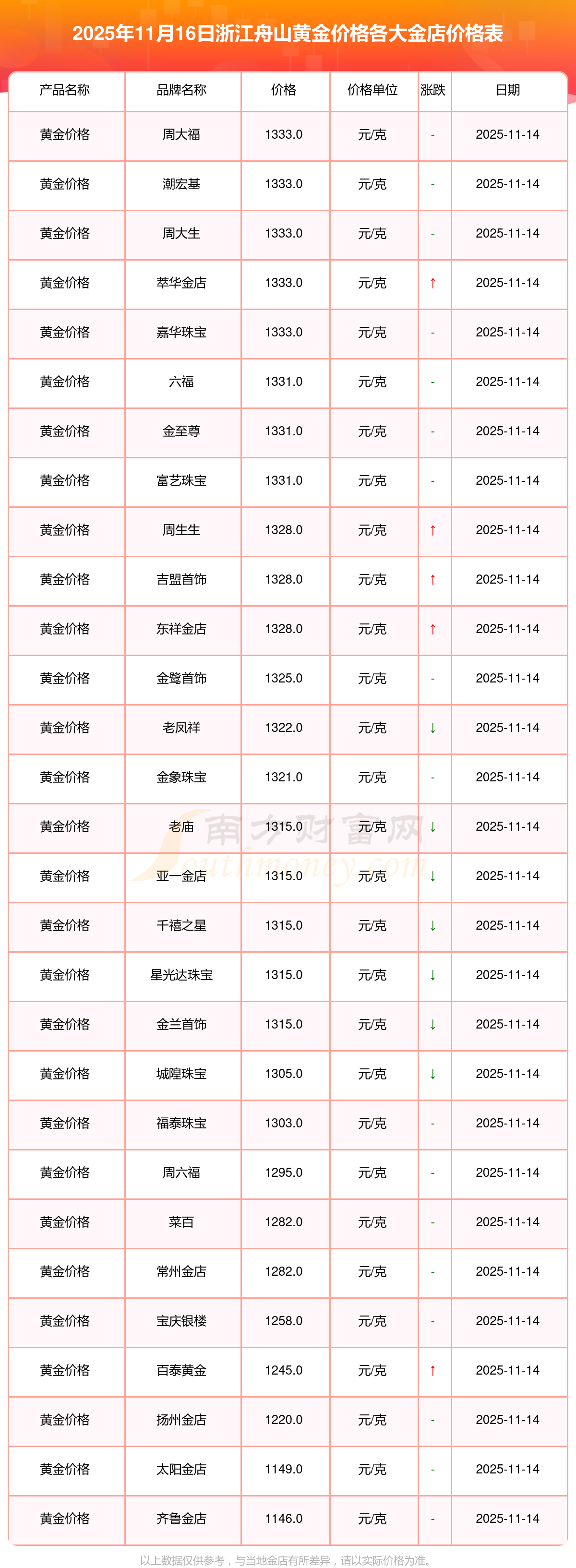 2025年11月16日,浙江舟山周大福、周大福、周大福、周大福、周大福、周大福、周大福、老鳳祥、老鳳祥、老鳳祥、周六福等各大金店品牌黃金價(jià)格今日價(jià)格如下:周大福1333.0元/克、周大福646.0元/克、周大福1333.0元/克、周大福46320.0、周大福18410.0、周大福41780.0、周大福1167.0元/克、老鳳祥1322.0元/克、老鳳祥600.0元/克、老鳳祥1322.0元/克、周六福1295.0元/克。