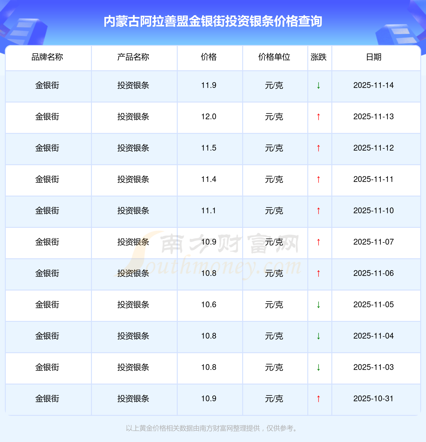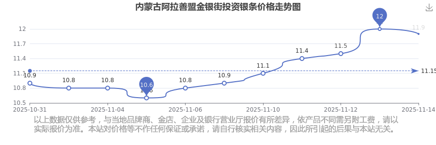 今日(2025年11月16日),內(nèi)蒙古阿拉善盟金銀街投資銀條價(jià)格:11.9元/克。