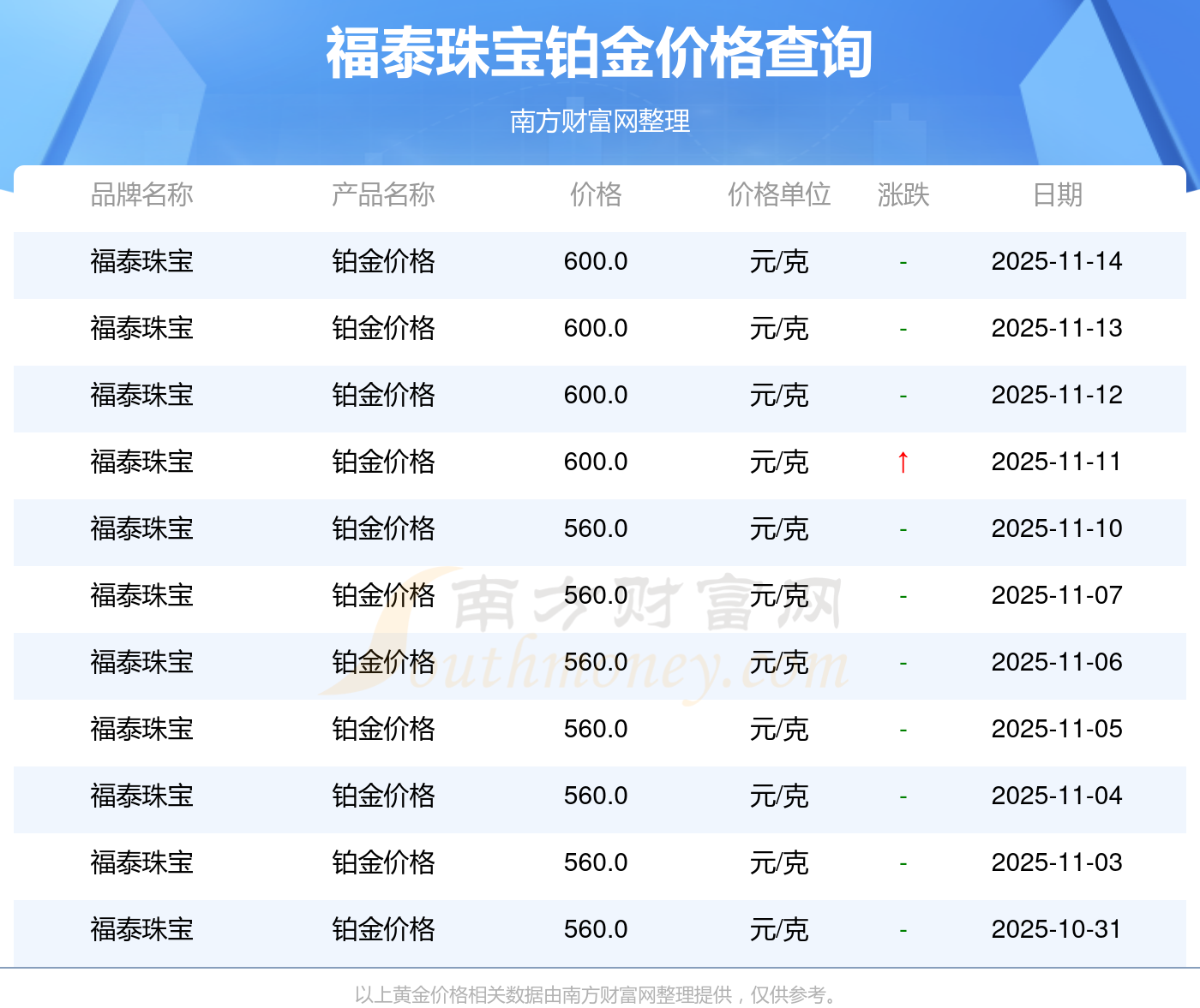 2025年11月16日福泰珠寶鉑金價格為600.0元/克。