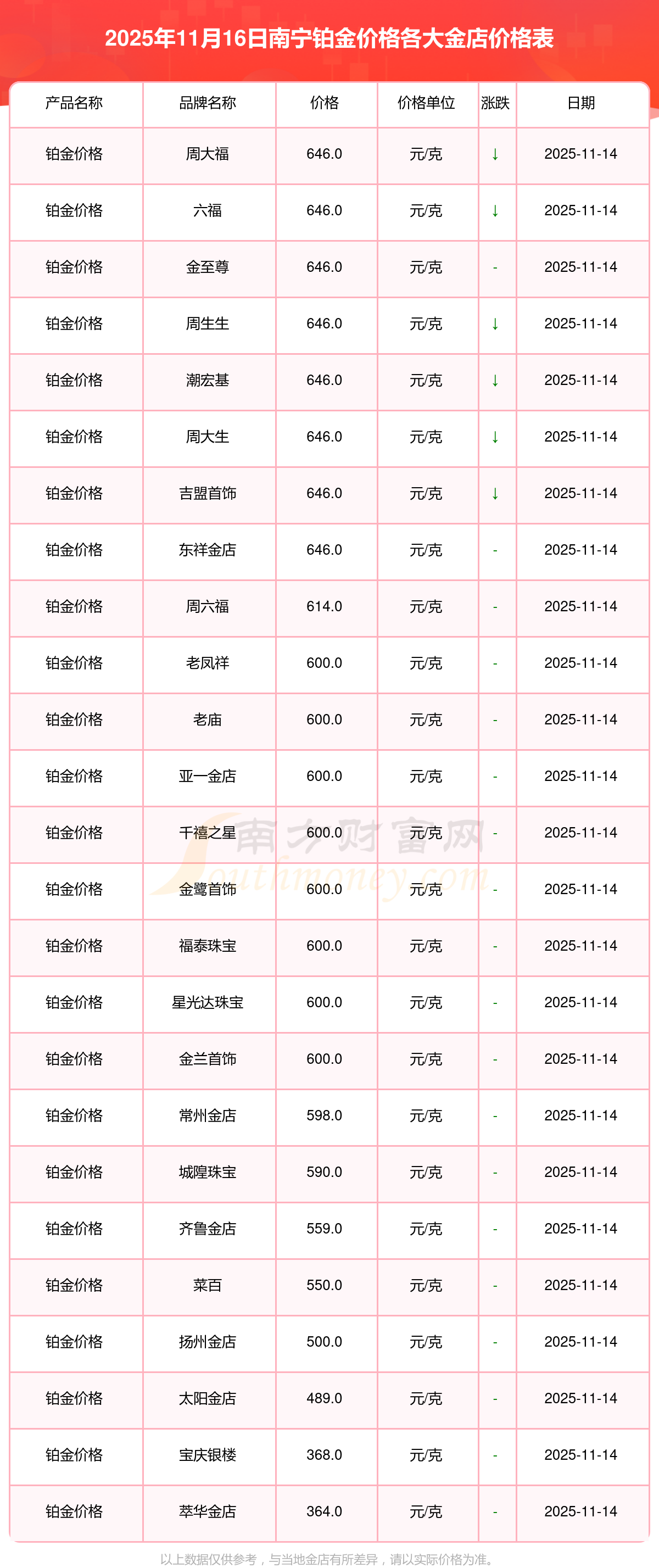 一、2025年南寧鉑金價格今日價格最新匯總表,2025年11月16日南寧各大金店鉑金價格是多少錢?
