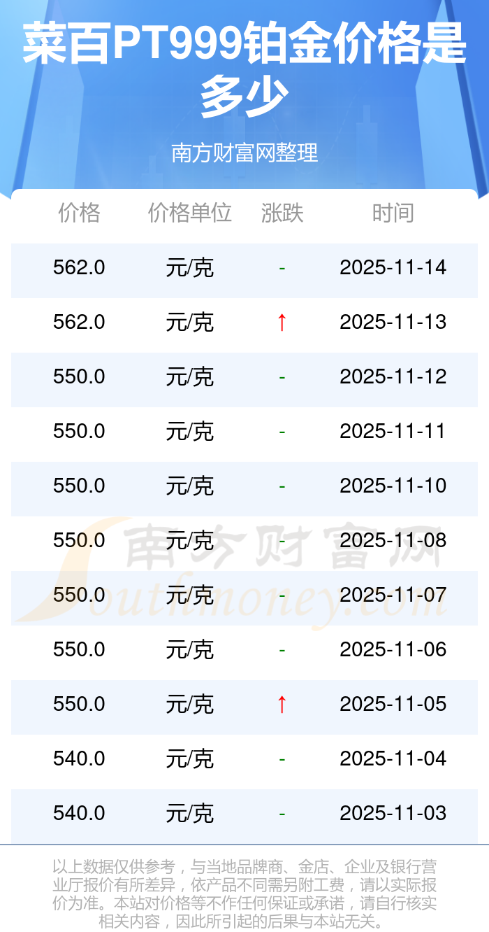 562.0元/克的價(jià)格,是菜百今日 PT999鉑金的最新行情。