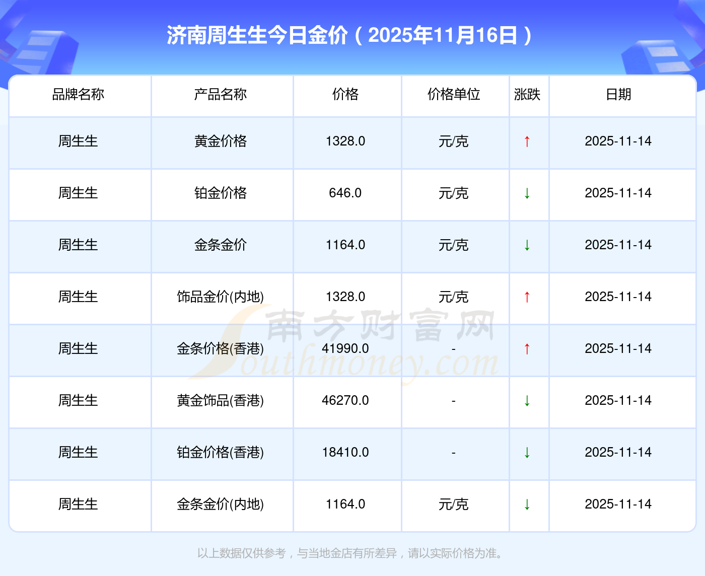 2025年11月16日濟(jì)南周生生現(xiàn)在購買一克黃金需要支付多少錢?黃金價(jià)格1333.0元/克,鉑金價(jià)格646.0元/克,飾品金價(jià)(內(nèi)地)1333.0元/克,黃金飾品(香港)46320.0,鉑金價(jià)格(香港)18410.0,金條價(jià)格(香港)41780.0,金條金價(jià)(內(nèi)地)1167.0元/克,黃金價(jià)格1322.0元/克,鉑金價(jià)格600.0元/克,足金價(jià)格1322.0元/克,黃金價(jià)格1295.0元/克。